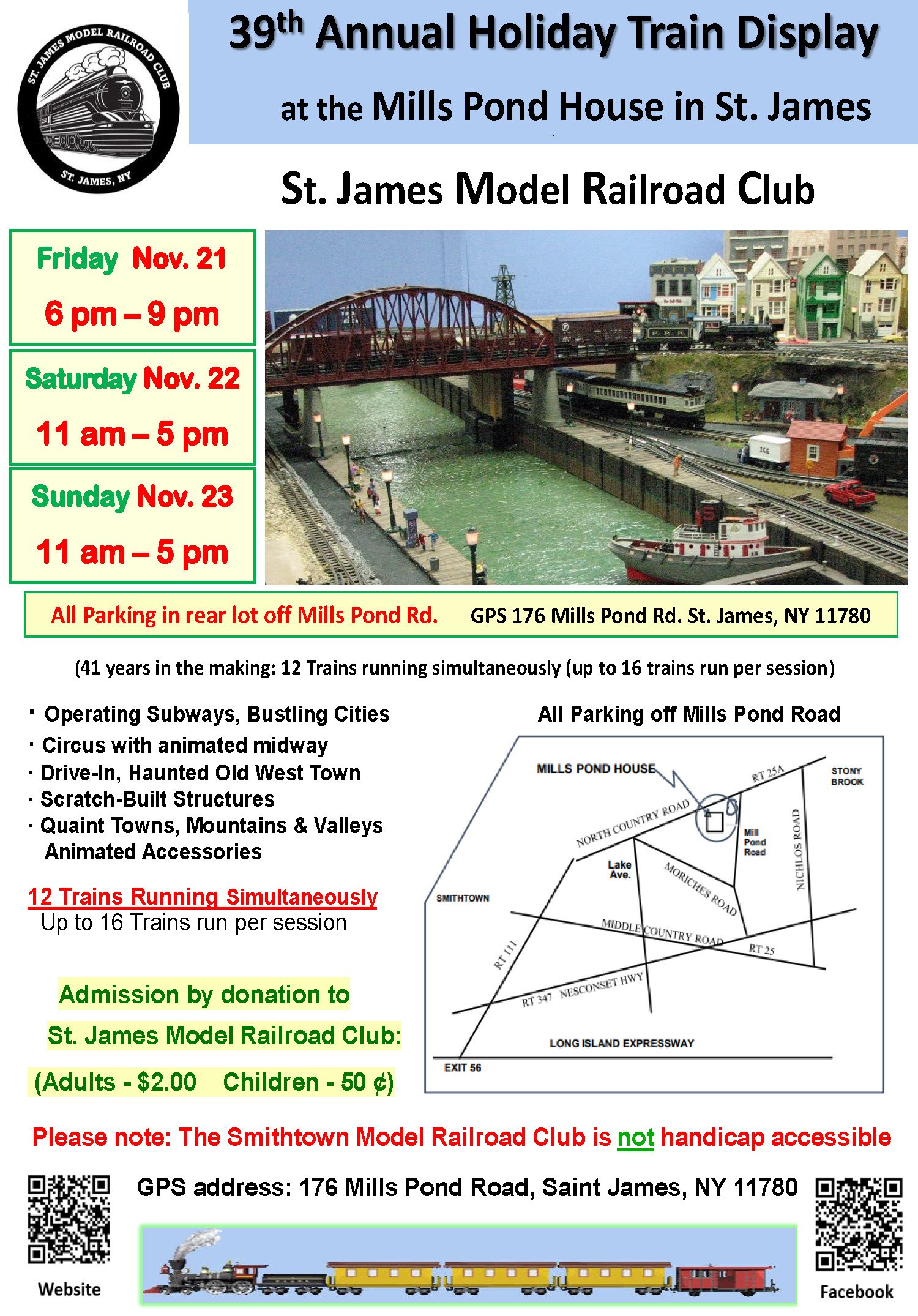 39th Annual Holiday Train Display - 12 trains running simultaneously (up to16 trains per session). All Parking in rear lot off Mills Pond Road-GPS 176 Mills Pond Road, St. James, NY 11780